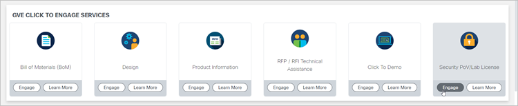 - Once you reach the GVE Client Experience Portal (CEP), on the Security PoV/Lab License object, select Engage.